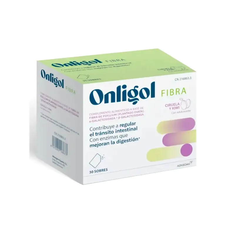 Onligol Fibra Ciruela y Kiwi es un complemento alimenticio en sobres que combina fibra de ciruela y kiwi. La fibra alimentaria consumida en cantidad adecuada favorece el funcionamiento normal del tránsito intestinal.