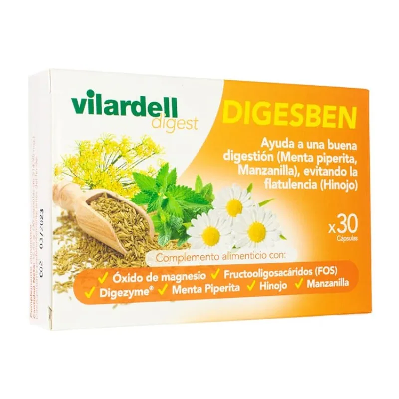 Vilardell Digest Digesben es un complemento alimenticio en cápsulas que combina sales minerales, enzimas y extractos herbales. Cada envase contiene 30 cápsulas diseñadas para aportar componentes que contribuyen al bienestar durante el proceso digestivo. Este formato facilita su toma antes o durante las comidas principales.