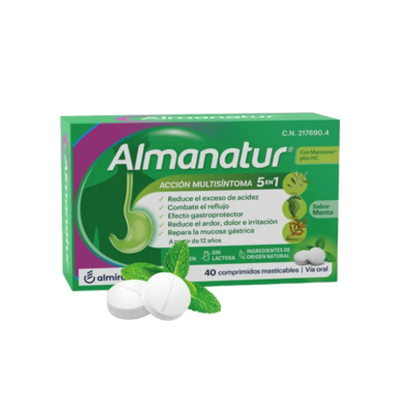 Almanatur Sabor Menta es un producto sanitario formulado en comprimidos masticables que combina alginato de magnesio, carbonato de calcio, Mucosave™ plus HC y bicarbonato de potasio. Está pensado para adultos y adolescentes a partir de 12 años.