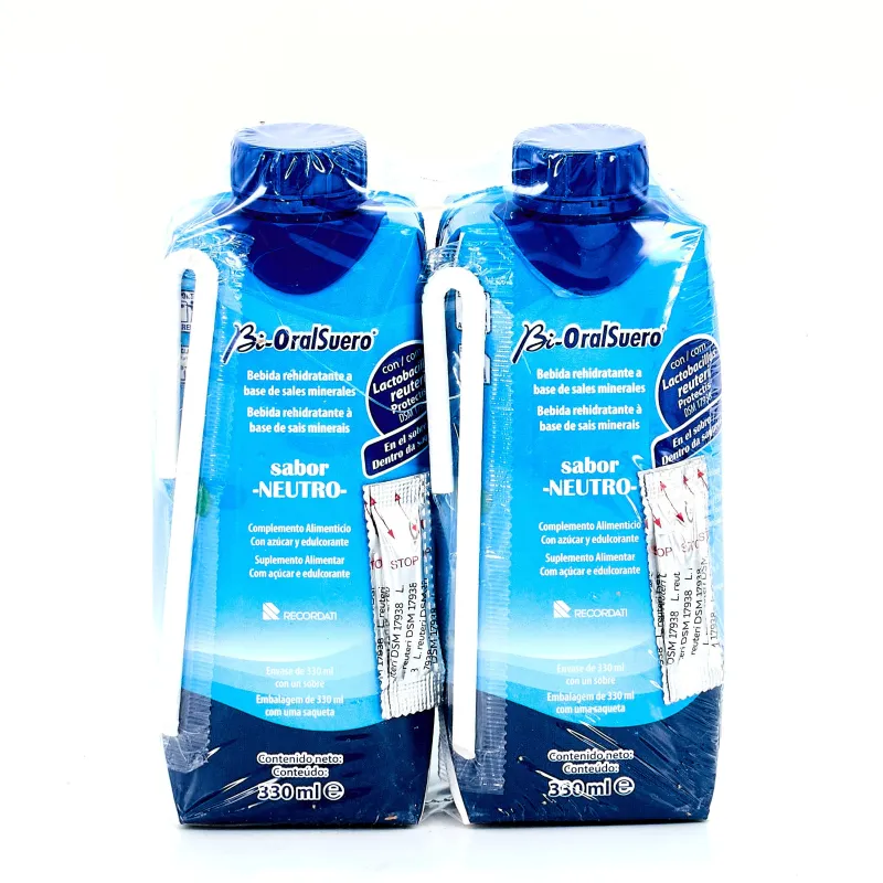 Bi-OralSuero Neutro bricks 2x330 ml es una solución de rehidratación oral que combina sales minerales con el probiótico Lactobacillus reuteri Protectis. Esta fórmula aporta electrolitos esenciales, como sodio, potasio y cloruro, junto con glucosa en proporciones fisiológicas, y microorganismos vivos seleccionados para contribuir al equilibrio de la microbiota intestinal. Su presentación en bricks individuales con cañita integrada permite la liberación simultánea de sales y probiótico al ingerir, ofreciendo un sistema práctico para apoyar el mantenimiento del balance hídrico y el bienestar digestivo.