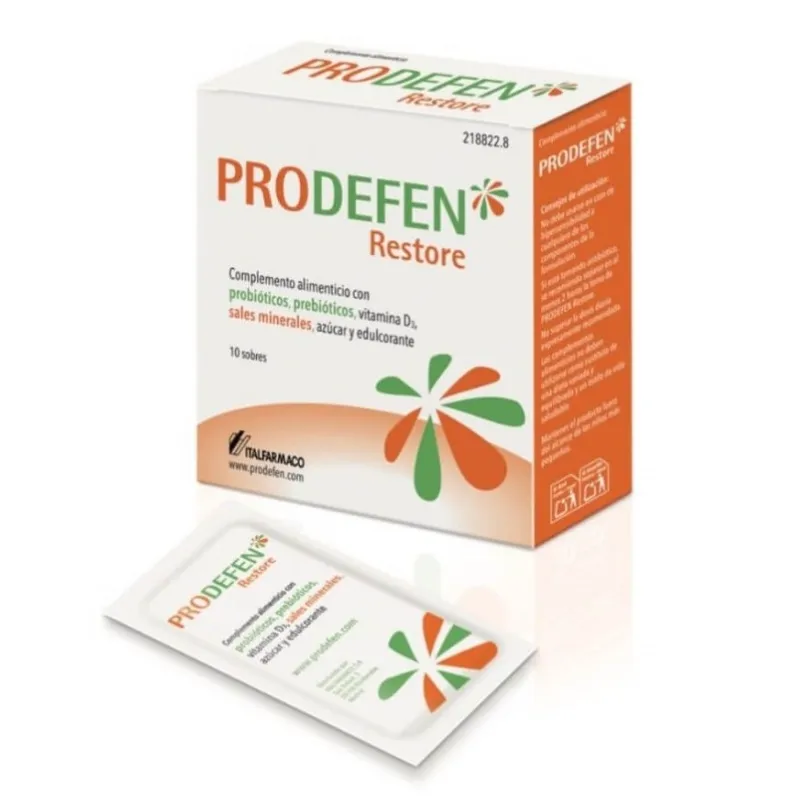 Prodefen Restore, 10 sobres es un complemento alimenticio que combina diversas cepas de probióticos junto con fructooligosacáridos y vitamina D3. Los probióticos son microorganismos vivos que contribuyen al mantenimiento de la flora intestinal, y los fructooligosacáridos actúan como sustratos de dichos microorganismos. La vitamina D3 contribuye al funcionamiento normal del sistema inmunitario, aportando un soporte para las defensas habituales del organismo. Este complemento está formulado para quienes buscan un apoyo nutricional que favorezca la comodidad digestiva en su día a día.