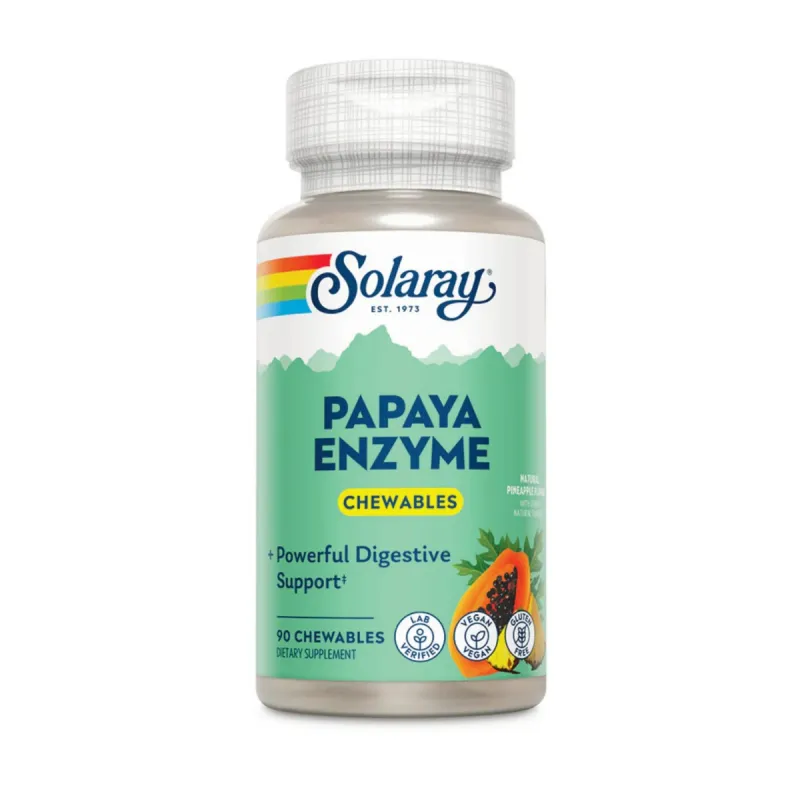 Solaray Papaya Flex Sabor Piña es un complemento alimenticio en formato de comprimidos masticables que incorpora extracto de papaya y enzimas digestivas naturales. Cada comprimido contiene papaína, una enzima proteolítica extraída de la fruta de papaya, así como otros compuestos de origen vegetal que contribuyen a la función digestiva. Este producto ha sido diseñado para facilitar la descomposición de proteínas y favorecer el tránsito gastrointestinal. Su presentación masticable con sabor a piña lo hace agradable de consumir en cualquier momento del día, incorporándose con facilidad a las rutinas habituales de ingesta tras las comidas principales.