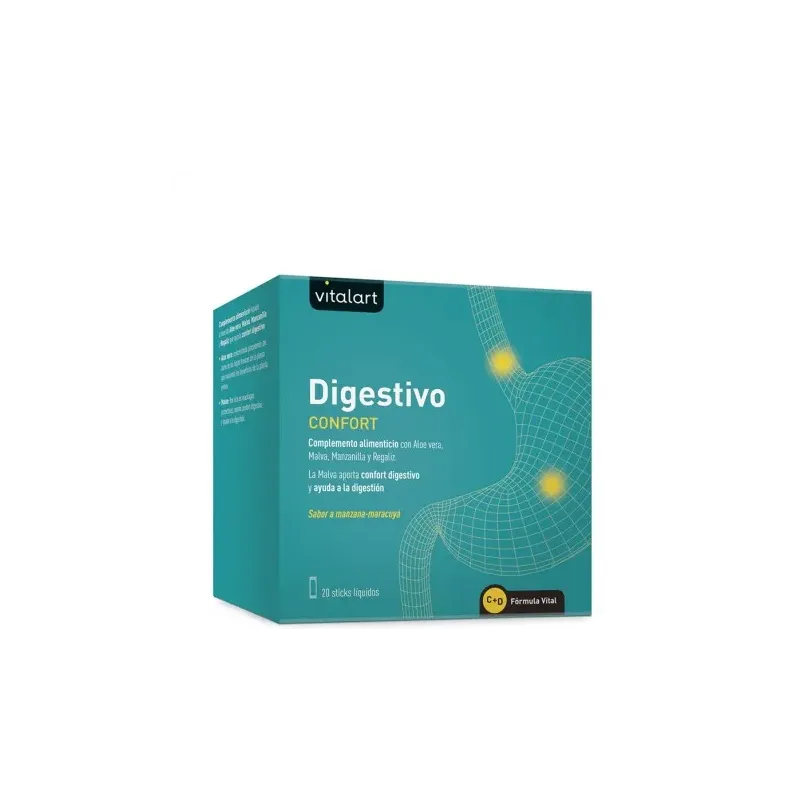 Vitalart Digestivo Confort es un complemento alimenticio presentado en 20 sticks líquidos de 10 ml, que combina extractos de plantas digestivas como aloe vera, malva, manzanilla y regaliz. Su formulación está pensada para contribuir al confort tras comidas copiosas o irritantes, ayudando a mantener la función normal de la mucosa gástrica y la sensación de bienestar digestivo.