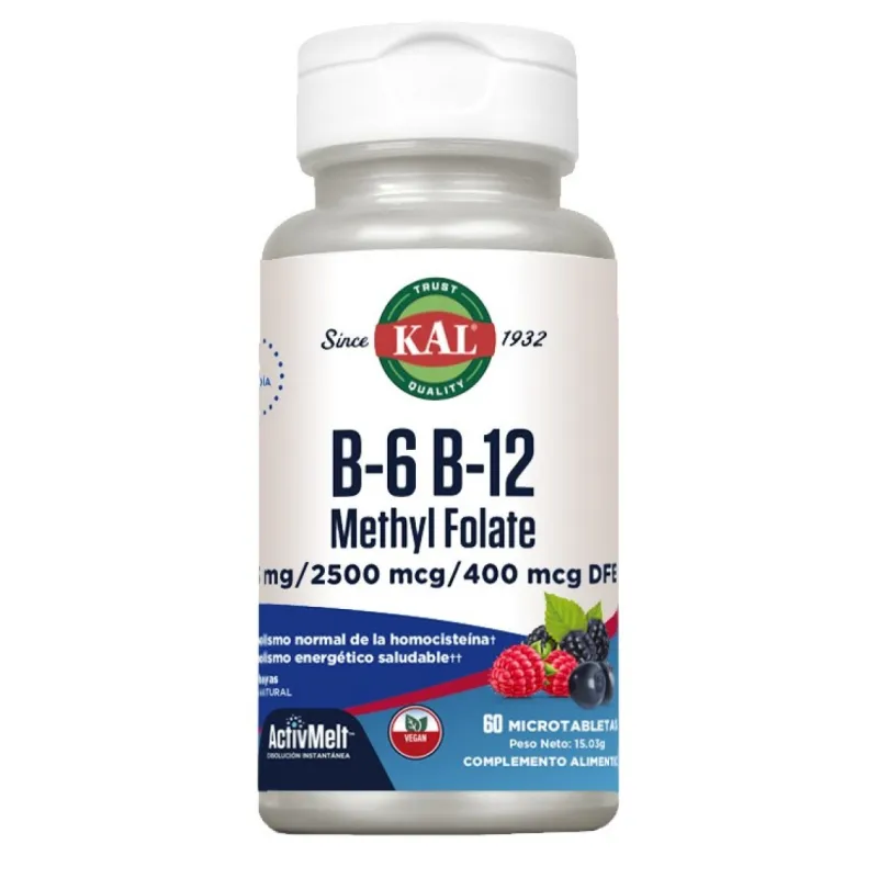 Solaray B6/B12 Methyl Folate es un complemento alimenticio en comprimidos que aporta vitamina B6 en forma de piridoxal-5'-fosfato, vitamina B12 como metilcobalamina y ácido fólico en forma de metilfolato, contribuyendo a una mayor biodisponibilidad. Estas vitaminas participan en procesos esenciales del organismo, como el metabolismo energético, la función neuronal y la síntesis de células sanguíneas. La vitamina B6 interviene en el metabolismo normal de proteínas, glucógeno y de la homocisteína; la vitamina B12 y el metilfolato participan en la división celular y en el mantenimiento de niveles adecuados de energía. Este formato en comprimidos facilita su ingesta diaria y está formulado para personas con dietas deficientes en vitaminas B, en situaciones de mayor demanda o durante períodos de recuperación.