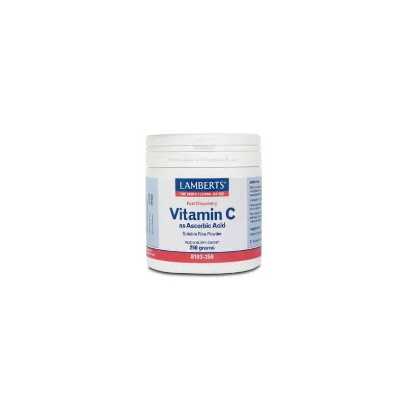 Envase de 250 g de LAMBERTS Ácido Ascórbico en polvo. Formato apto para vegetarianos y veganos, libre de lactosa, gelatina y alérgenos comunes.