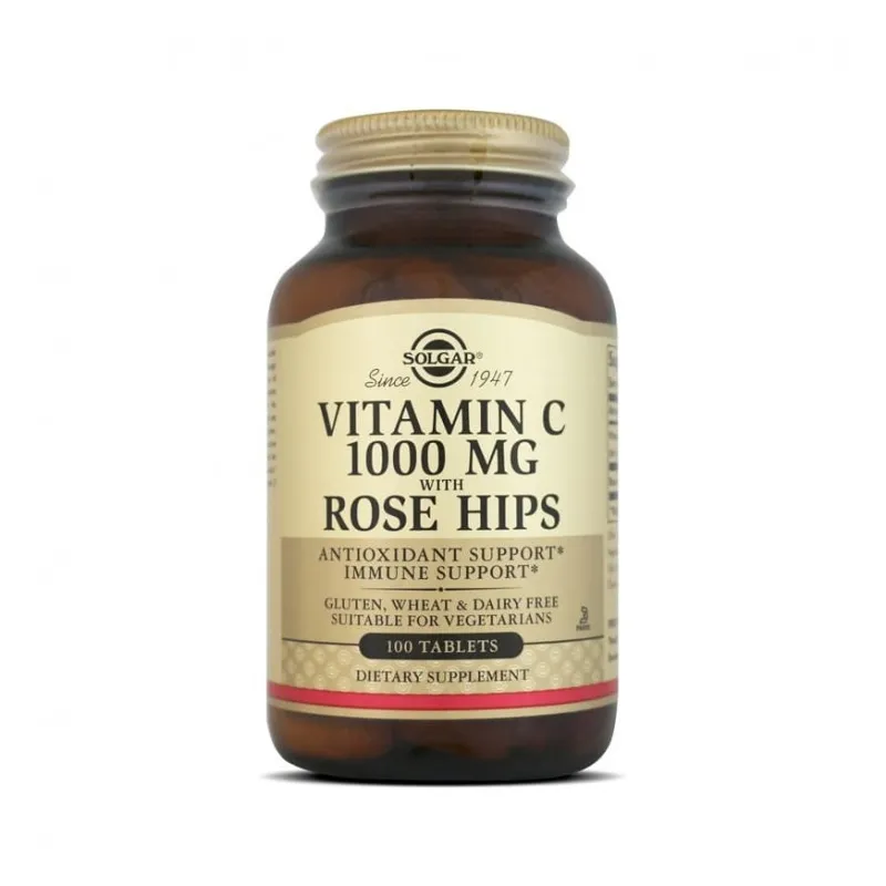 Solgar Rose Hips C 1000 mg es un complemento alimenticio en comprimidos que aporta 1000 miligramos de vitamina C en forma de ácido ascórbico, junto con rosa mosqueta (Rosa canina) en polvo. Está concebido para aquellos que buscan una mayor concentración de vitamina C para incorporarla fácilmente en su rutina diaria. La vitamina C es esencial y debe obtenerse de fuentes externas, mientras que la rosa mosqueta aporta micronutrientes complementarios que favorecen la biodisponibilidad y la acción antioxidante.