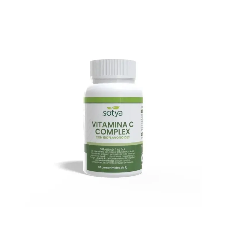 Sotya Vitamina C Complex al día, 90 comprimidos es un complemento alimenticio que combina vitamina C procedente de escaramujo, acerola y bioflavonoides cítricos.