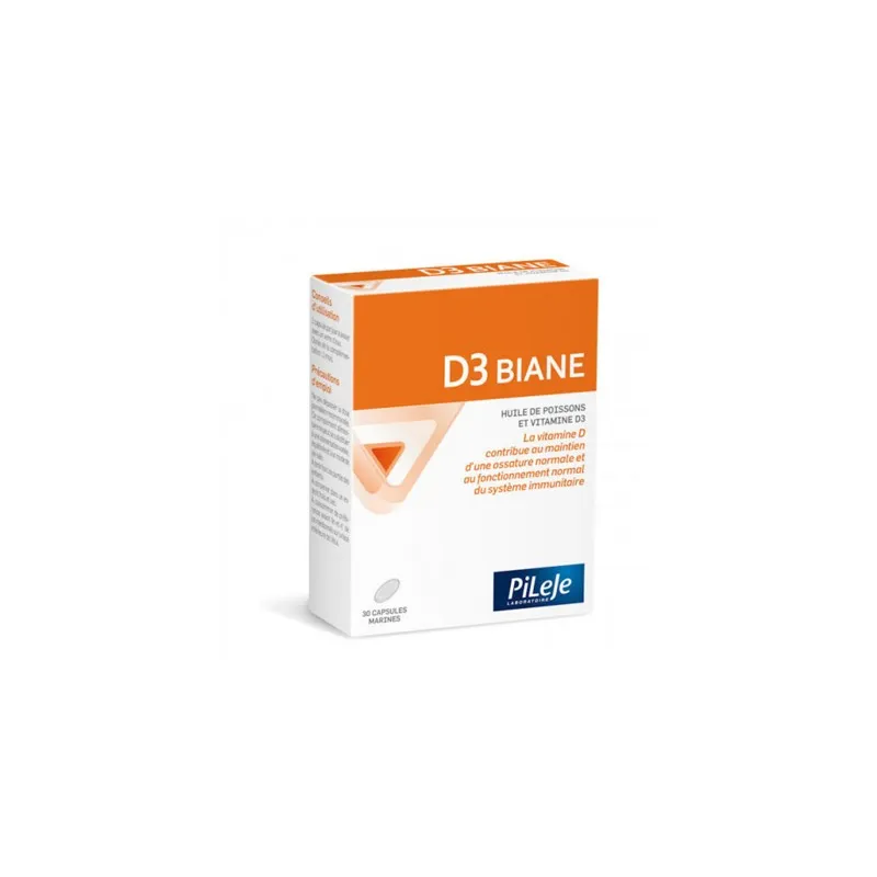 Pileje D3 Biane 1000 UI es un complemento alimenticio en cápsulas especialmente formulado con vitamina D3 (colecalciferol) y aceite de pescado. La vitamina D3 contribuye al mantenimiento de los niveles normales de calcio y fósforo en sangre y apoya la salud de los huesos y los dientes. El aceite de pescado aporta ácidos grasos que favorecen la absorción y biodisponibilidad de la vitamina. Este complemento nutritivo está destinado a personas con riesgo de déficit o con requerimientos aumentados de vitamina D.