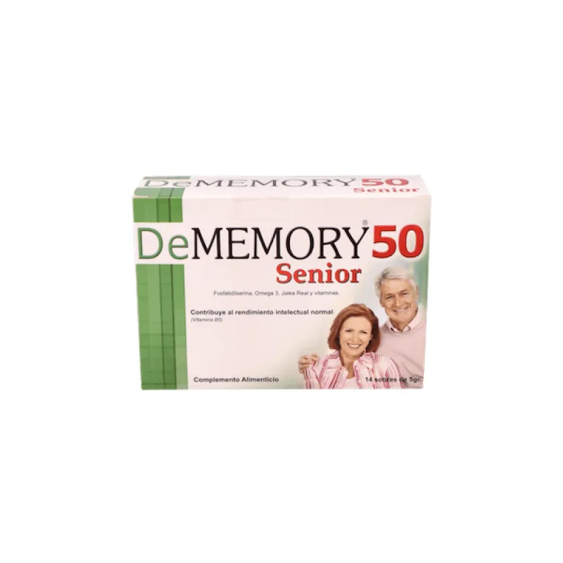 Dememory senior 50 es un complemento alimenticio especialmente formulado para personas de la tercera edad que desean apoyar la función cognitiva normal. Cada sobre contiene una mezcla de DHA de origen marino, vitamina B5 y zinc, nutrientes implicados en el mantenimiento de la memoria, la concentración y otras capacidades intelectuales. Este producto está diseñado para complementar una dieta equilibrada y contribuir al aporte diario de nutrientes esenciales destinados al rendimiento mental. La fórmula está libre de colorantes artificiales y se presenta en sobres monodosis para mayor comodidad de uso.