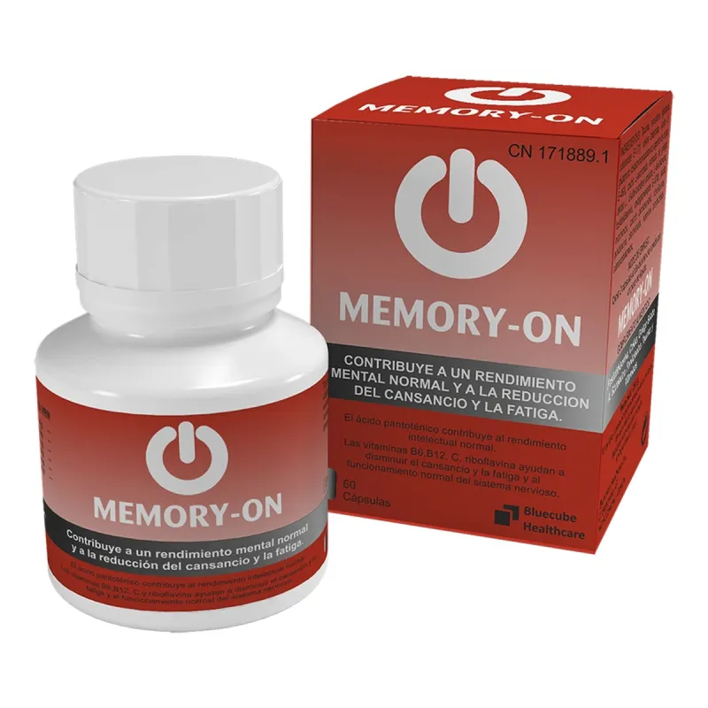 Bluecube Memory On es un complemento alimenticio en cápsulas formulado para proporcionar nutrientes que participan en el funcionamiento normal del sistema nervioso y en el metabolismo energético. Su fórmula combina fosfatidilserina, extracto de Ginkgo biloba, vitaminas del grupo B, vitamina C, aminoácidos y minerales seleccionados para contribuir al rendimiento intelectual y ayudar a mantener la vitalidad en períodos de actividad mental o cansancio leve.
