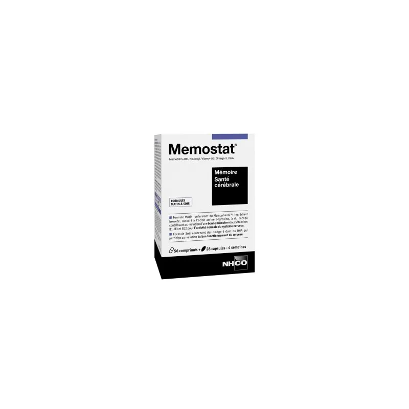 NHCO Memostat es un complemento alimenticio formulado con ingredientes seleccionados como extracto de ginkgo biloba, vitaminas del grupo B (B6, B9, B12), fosfatidilserina y colina. Estos nutrientes contribuyen al funcionamiento normal del sistema nervioso y la neurotransmisión, participando en procesos cognitivos como la memoria, la concentración y el aprendizaje. El ginkgo biloba favorece la microcirculación cerebral, mientras que la fosfatidilserina y la colina son componentes esenciales de las membranas neuronales y precursores de neurotransmisores.