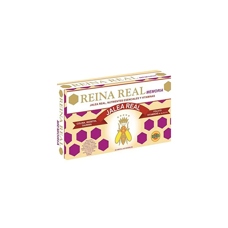 Robis Reina Real Memoria es un complemento alimenticio en formato de ampollas que combina jalea real fresca, fósforo y vitaminas B (B2, B5 y B12). Está formulado para aportar nutrientes que participan en el metabolismo energético normal y en el mantenimiento de las funciones cerebrales dentro de un estilo de vida saludable.