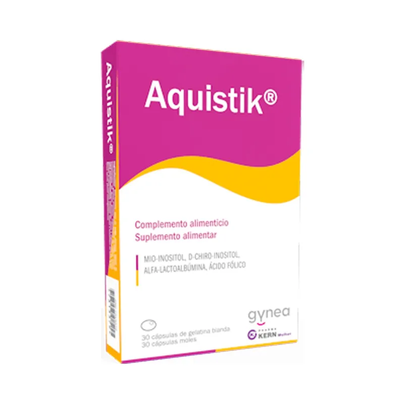 Aquistik es un complemento alimenticio creado por Gynea (Kern Pharma) que combina mioinositol, D-quiroinositol, alfa-lactoalbúmina y ácido fólico. Estos ingredientes se seleccionan por su uso en el apoyo al equilibrio hormonal y al metabolismo de la glucosa, especialmente en mujeres con síndrome de ovario poliquístico (SOP) o que buscan una ayuda nutricional para la fertilidad. El formato en cápsulas blandas facilita su ingesta y absorción.