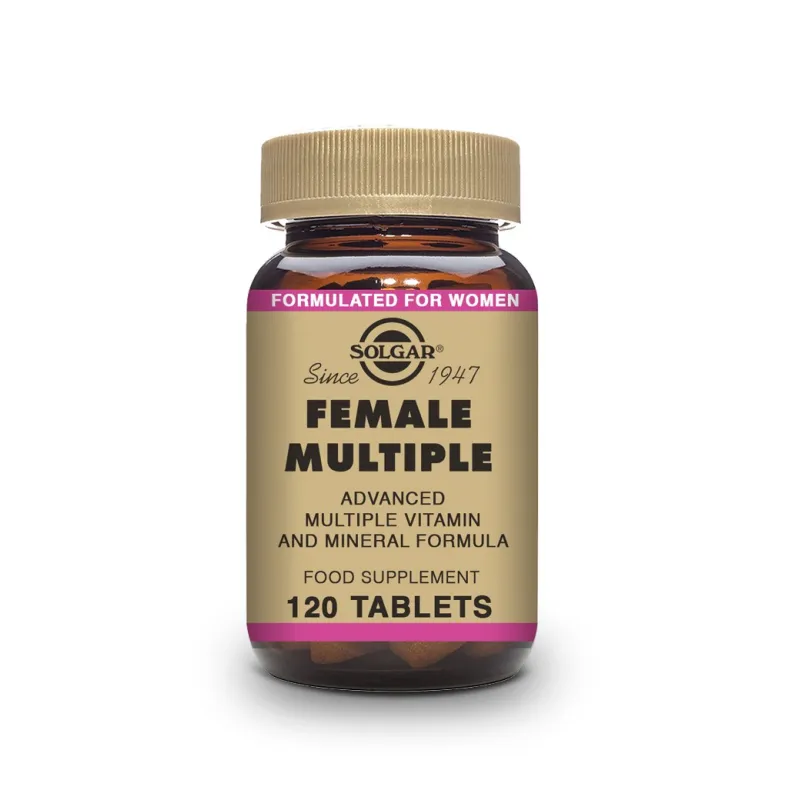 Solgar Female Múltiple (Complejo para la mujer), 120 comprimidos, es un complemento alimenticio diseñado especialmente para cubrir las necesidades nutricionales de la mujer en etapa fértil, gestación y premenopáusica. Contiene una mezcla equilibrada de nutrientes entre los que destacan calcio, hierro, magnesio, boro y vitaminas D, K y del grupo B, en las proporciones establecidas por la normativa vigente. Cada comprimido aporta minerales y vitaminas que contribuyen a complementar la dieta diaria y a mantener niveles adecuados de colágeno, hierro y calcio en el organismo femenino.