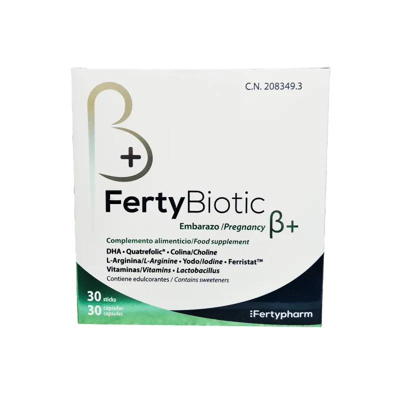 Fertybiotic Embarazo B+ es un complemento alimenticio formulado para aportar nutrientes específicos durante el primer trimestre del embarazo. Su fórmula combina L-arginina, colina, DHA procedente de microalgas, Quatrefolic®, Ferristat™ (hierro) y probióticos Synbalance® EnjoyMum (Lactobacillus gasseri y Lactobacillus acidophilus).