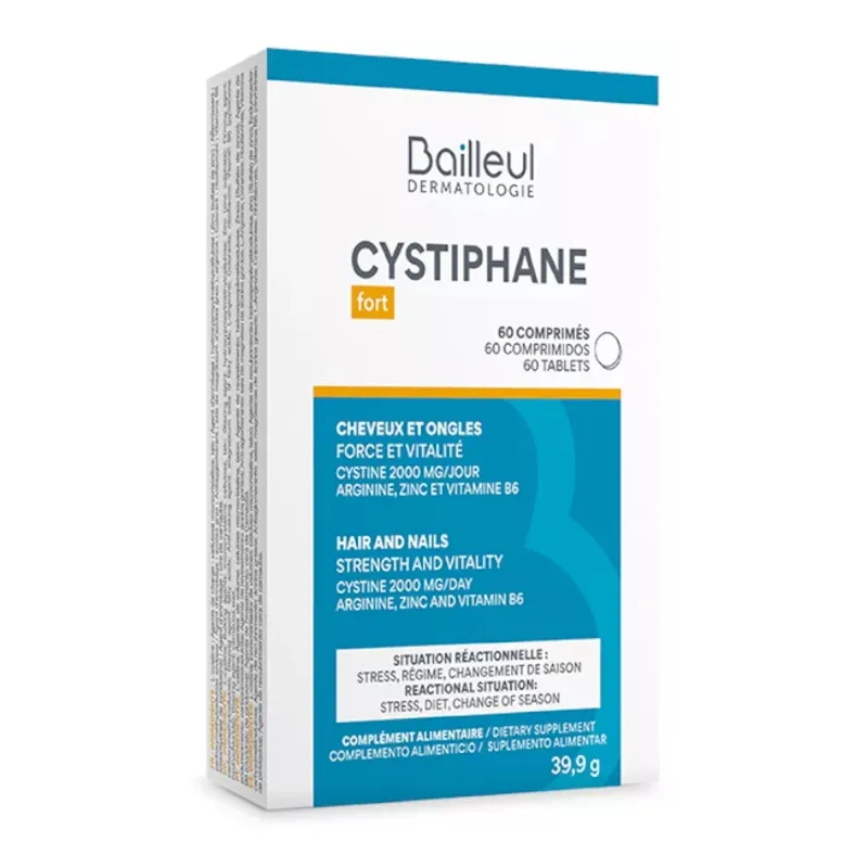 Cystiphane Forte es un complemento alimenticio en comprimidos que aporta nutrientes esenciales para la salud del cabello y las uñas. Su fórmula incluye L-cisteína, biotina, zinc y selenio, entre otros ingredientes, para apoyar el aporte de micronutrientes relacionados con la estructura queratínica. Estos nutrientes han sido seleccionados por su papel en procesos de síntesis proteica y protección celular, promoviendo la funcionalidad de estructuras queratínicas. El formato de 120 comprimidos permite un mes de tratamiento continuo y cómodo.