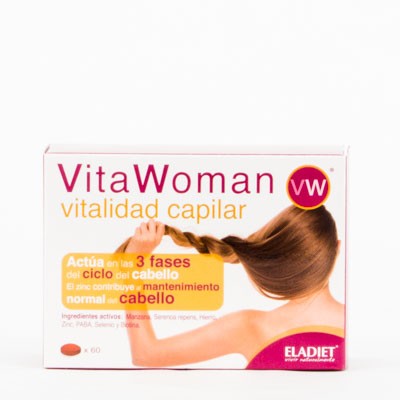 Eladiet Vitawoman vitalidad capilar es un complemento alimenticio diseñado para complementar la dieta de personas que desean apoyar el ciclo de vida del cabello de forma natural. Formulado con vitaminas, minerales y extractos vegetales seleccionados, sus ingredientes contribuyen al mantenimiento normal de la estructura capilar y complementan hábitos de cuidado diario para lucir un cabello con aspecto saludable.