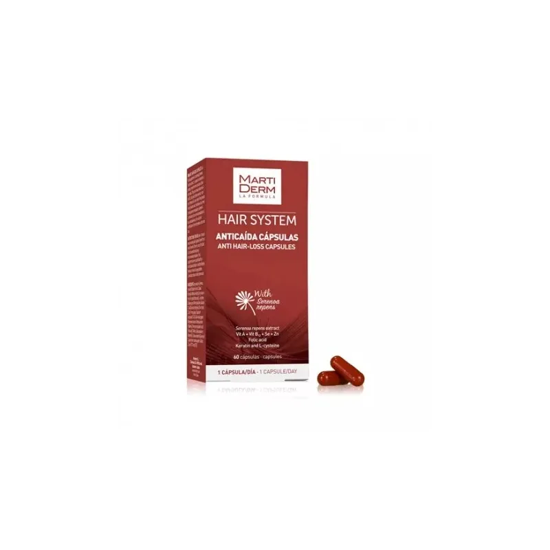 Martiderm Hair System Anticaída es un complemento alimenticio desarrollado para proporcionar micronutrientes clave que participan en el ciclo de crecimiento y fortalecimiento capilar. Su fórmula integra extractos vegetales, aminoácidos y vitaminas que contribuyen a asegurar un aporte nutricional específico.