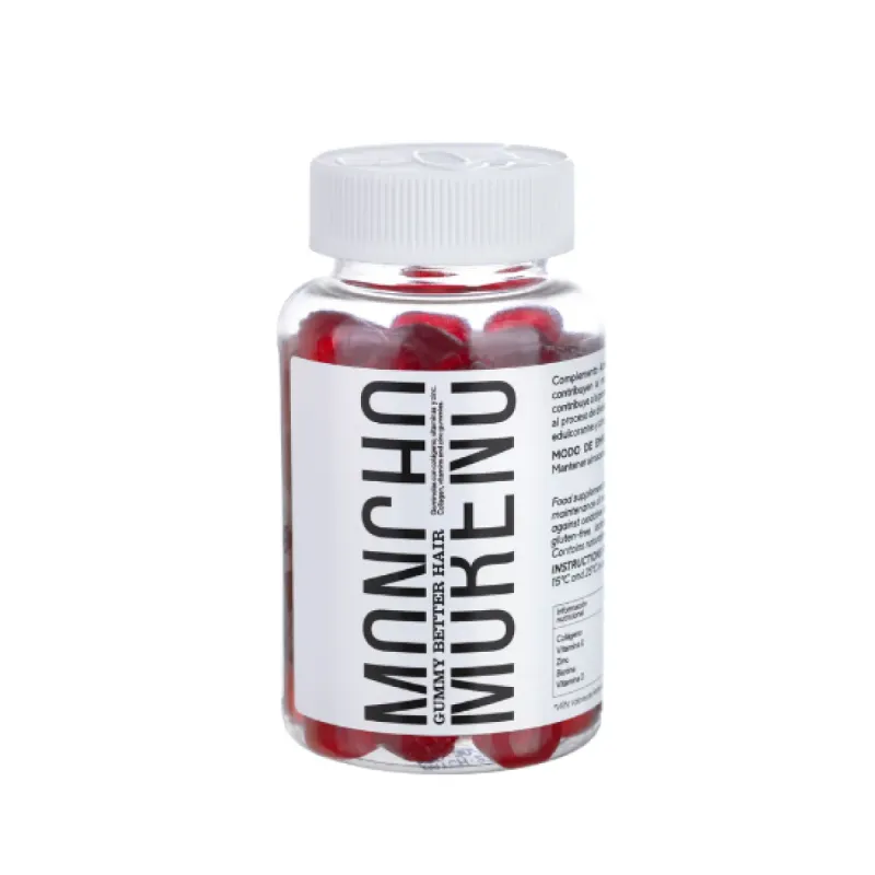 Moncho Moreno Gummy Better Hair es un complemento alimenticio en formato de gominolas con sabor a frambuesa, sin azúcar añadido. Su composición reúne una combinación de vitaminas, minerales y compuestos presentes de forma natural en alimentos, pensados para complementar la alimentación habitual con sustancias que se encuentran de forma natural en los alimentos y que están vinculadas a distintos aspectos del cuidado capilar.