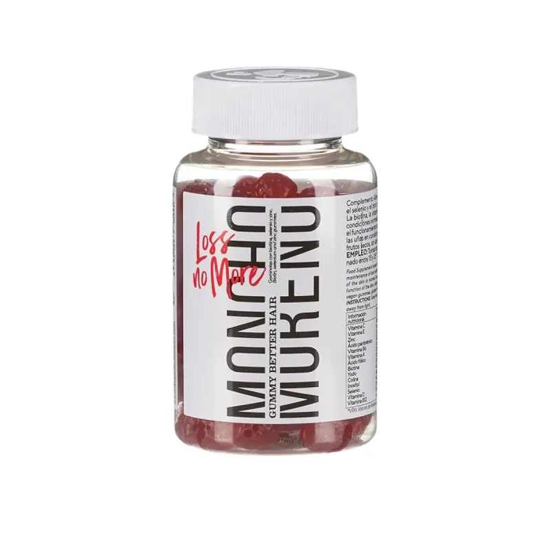 Moncho Moreno Gummy Loss No More es un complemento alimenticio presentado en forma de gominolas con sabor a fresa, pensado para complementar la ingesta de vitaminas, minerales y otros compuestos con roles nutricionales implicados en procesos fisiológicos vinculados con la nutrición capilar y el mantenimiento de las uñas.