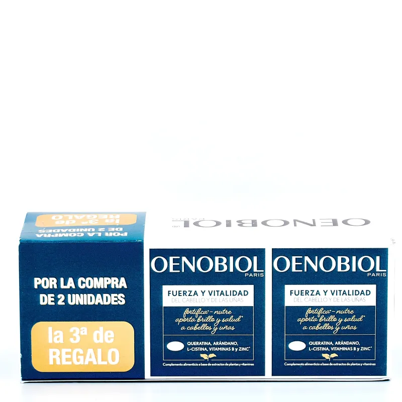 Oenobiol Fuerza y Vitalidad Triplo es un complemento alimenticio desarrollado para aportar nutrientes específicos dirigidos al cuidado del cabello y las uñas. Su formulación combina aminoácidos, extractos vegetales, vitaminas y minerales que contribuyen a mantener la integridad de la estructura capilar y ungueal. Cada componente ha sido seleccionado por su participación en procesos de síntesis de queratina, propiedades antioxidantes y en la microcirculación cutánea. Este producto está libre de gluten y apto para veganos.
