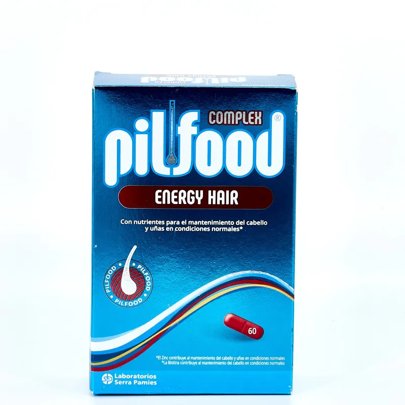 Pilfood Complex Energy Hair es un complemento alimenticio formulado con biotina, zinc, vitaminas del grupo B, aminoácidos como L-cisteína y L-metionina, y extracto de mijo. Estas sustancias contribuyen al mantenimiento normal del cabello y las uñas, al metabolismo energético y proteico, y al funcionamiento del sistema nervioso. Su fórmula ha sido diseñada para distribuir los nutrientes necesarios durante el día.