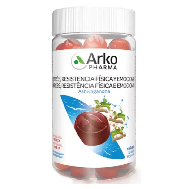 Complemento alimenticio con Ashwagandha, vitamina B6, magnesio y vitamina D para apoyar las capacidades físicas y emocionales en situaciones de tensión ocasional. 60 caramelos sabor cereza.