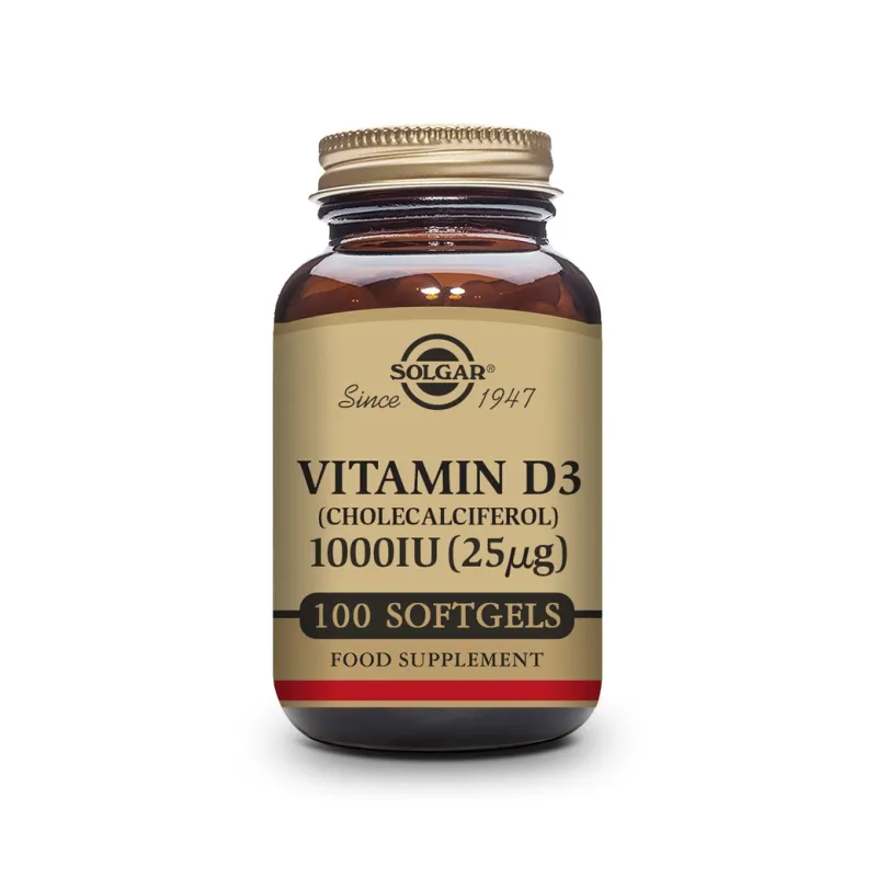 Solgar Vit D3 1000 UI es un complemento alimenticio que proporciona colecalciferol (vitamina D3) en cápsulas vegetales de fácil ingestión. Cada envase incluye 100 cápsulas con 25 mcg de vitamina D3, una dosis diseñada para quienes requieren un aporte suplementario más elevado. La vitamina D3 contribuye al mantenimiento de los niveles normales de calcio y fósforo en sangre, esenciales para la salud ósea y el funcionamiento del sistema inmunitario.
